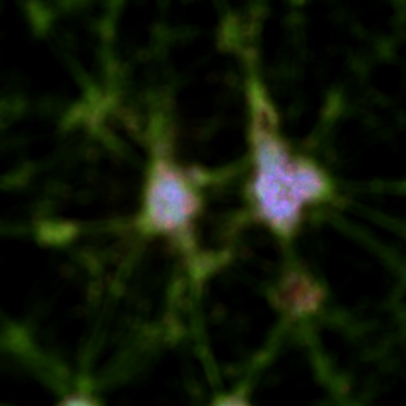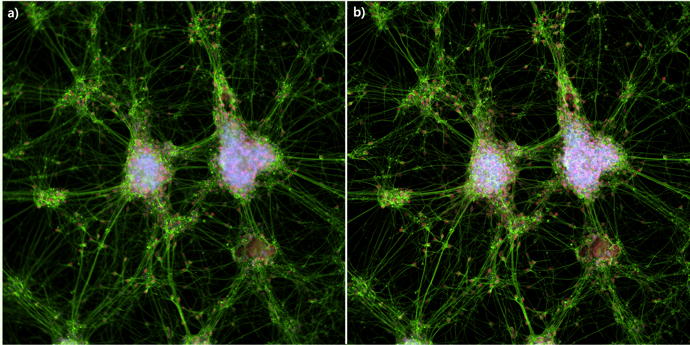 신경돌기(neurite, 초록색), 핵(nucleus, DAPI, 파란색) 및 시냅스 마커(synaptic marker, TRITC, 빨간색) 영역에서는 초점 손실이 관찰됨.