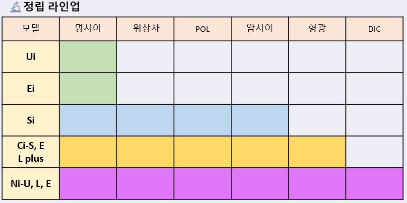 ※ 색칠된 부분은 확장이 다 가능함. ex) Si는 명시야, 위상차, POL, 암시야 가능